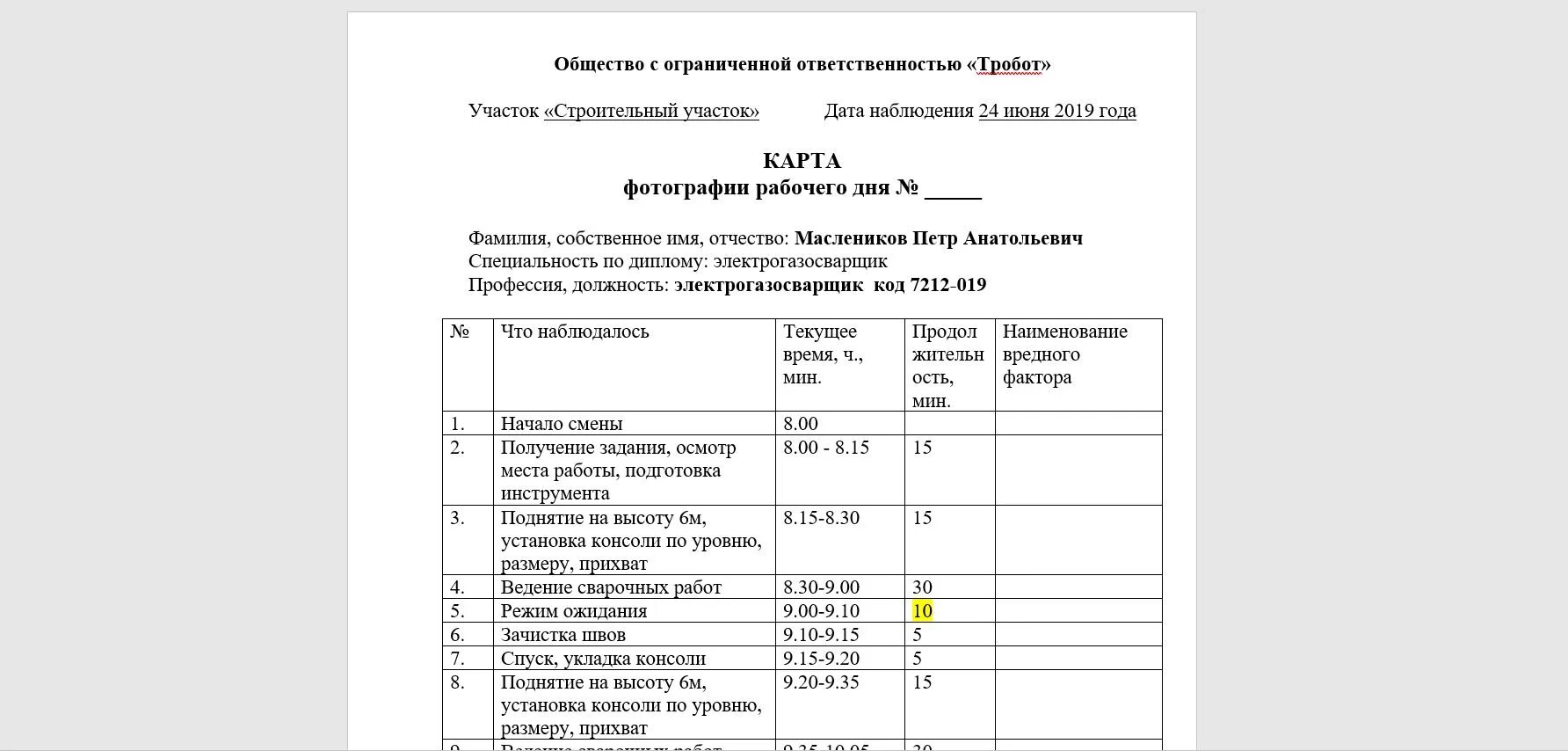 Карта рабочего дня работника образец.