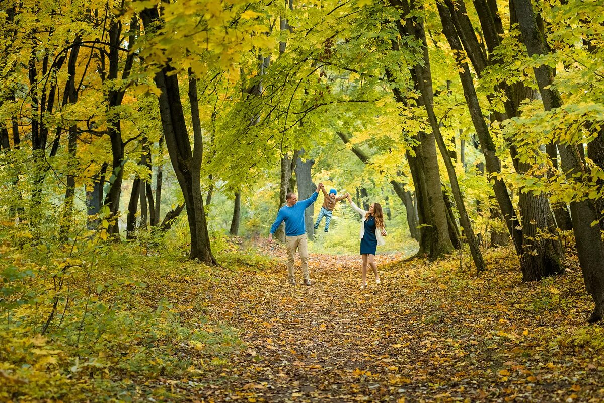 Семья на прогулке в лесу.