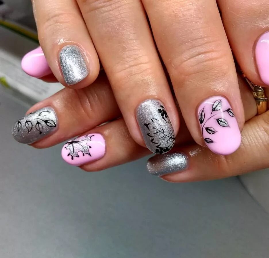 Ногти розовые с цветочками.