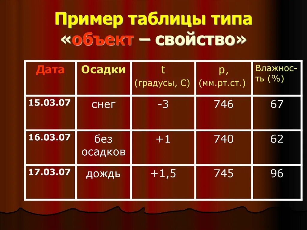 Пример таблицы типа объекты-свойства.